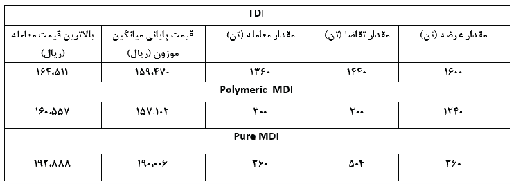 در خصوص محصولات MDI شرایط متفاوت بوده است. میزان عرضه این محصول در ماه مهر نسبت به ماه قبل از 2000 تن به 1240تن و همچنین میزان تقاضا و معامله انجام شده از 760 تن به 300 تن کاهش یافته است . از طرفی قیمت این محصول نیز در ماه مهر نسبت به ماه شهریور حدود 4 درصد کاهش را نشان می دهد.