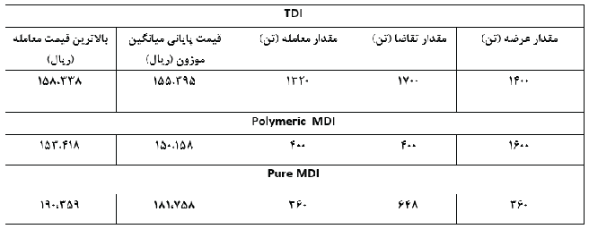 در خصوص محصولات MDI میزان عرضه در ماه آبان نسبت به ماه قبل از 1240 تن به 1600 تن و همچنین میزان تقاضا و معامله انجام شده از 300 تن به 400 تن افرایش یافته که حدود 33 درصد افزایش را نشان می دهد. از طرفی قیمت این محصول نیز در ماه آبان نسبت به ماه مهر حدود 5 درصد کاهش داشته و به طور میانگین به رقم 150،158 ریال رسیده است.