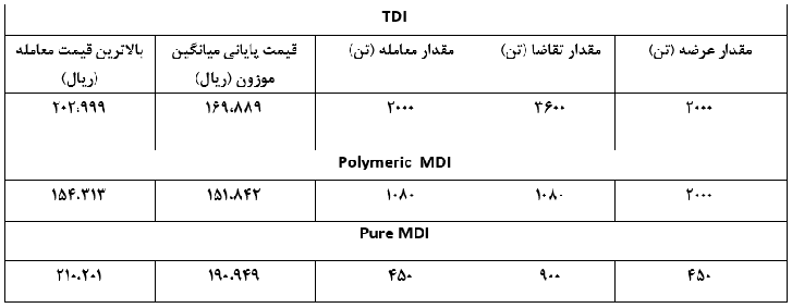 در خصوص محصولات MDI میزان عرضه در ماه آذر نسبت به ماه قبل از 1600تن به 2000 تن و همچنین میزان تقاضا و معامله انجام شده از 400 تن به 1080 تن افرایش یافته که بیش از 2.5 برابر شده است. . از طرفی قیمت این محصول نیز در ماه آذر نسبت به ماه آبان بیش از 1 درصد افزایش داشته و به رقم 151،842 ریال رسیده است.