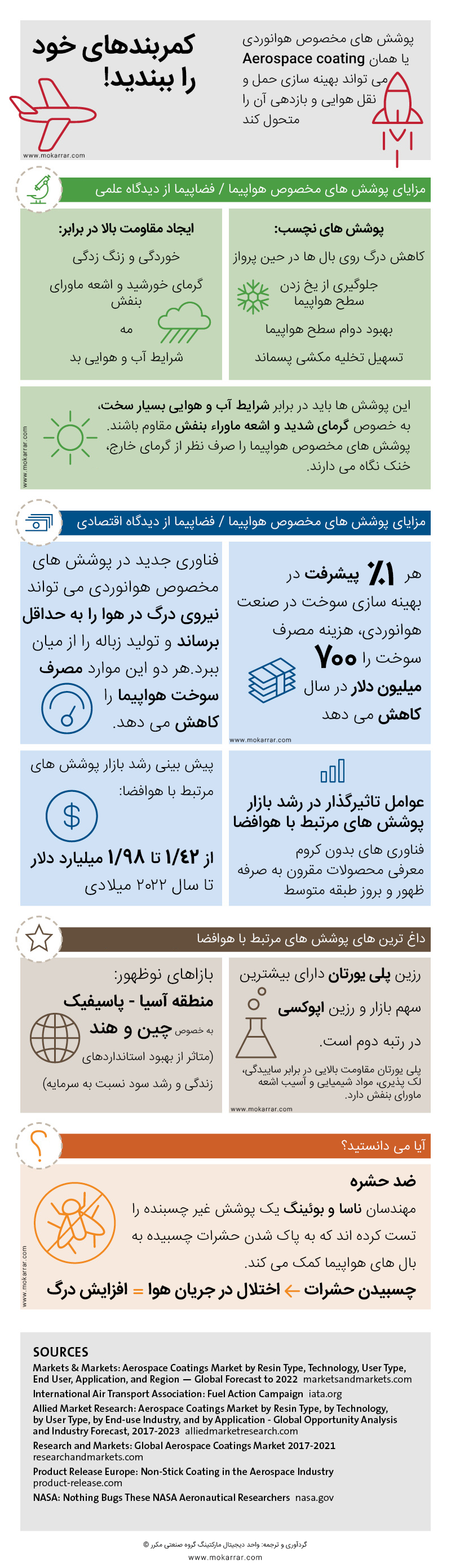در این اینفوگرافیک، انواع کاربردهای پوشش مخصوص صنایع هوانوردی شرح داده شده است. رزین پلی یورتان و رزین اپوکسی در این صنعت کاربرد دارند.